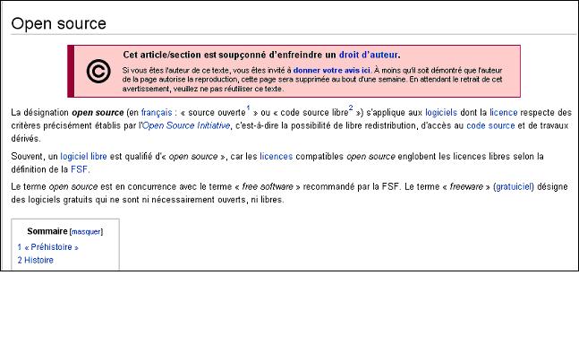 Il y a quelques jours, un ami attirait mon attention sur le fait quelque peu incongru que l’article Open source de Wikipédia était soupçonné… d’enfreindre un droit d’auteur !