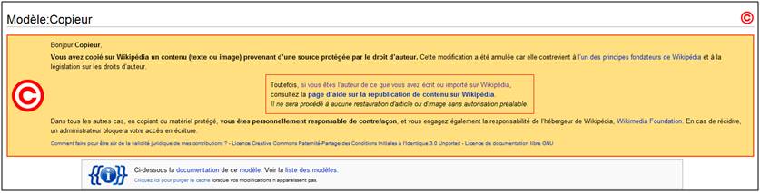Lorsqu’un contenu de l’encyclopédie éveille un soupçon de violation d’un droit d’auteur (on verra plus loin comment ce premier repérage peut s’effectuer), il est identifié comme tel par le biais d’un bandeau particulier apposé en tête de l’article. Cette première opération peut être le fait d’un administrateur de Wikipédia ou d’un simple utilisateur de l’encyclopédie. Une page de discussion est alors ouverte indiquant la personne qui a repéré le copyvio et lui permettant d’indiquer les raisons qui ont éveillé ses soupçons. L’auteur du passage litigieux (qui peut être un utilisateur disposant d’un profil sur Wikipédia ou simplement identifié par le biais de son IP) est alors invité à se manifester pour fournir des explications (une sorte de procédure contradictoire somme toute, voir ici un exemple). Un bandeau « Copieur » peut même être apposée sur sa page personnelle de discussion pour l’inciter à venir se justifier (chose qui peut être assez mal vécue par l’intéressé). Se livrer à des actes de copyvio peut également finir par entraîner des sanctions et notamment le blocage d’un compte appliqué par les administrateurs de Wikipédia.