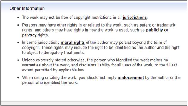 Au-dessous, figure un champ « Others informations », très important, car c’est à ce niveau que l’on mesure que la PDM sera peut-être mieux armée pour s’adapter aux différents contextes juridiques au niveau international. Il est d’abord précisé « The work may not be free of copyright in all juridictions ». C’est la conséquence des durées variables du droit d’auteur selon les pays (et une source de difficultés quand même pour la PDM et les utilisateurs). Un paragraphe indique bien également qu’un droit moral peut subsister dans les pays qui le reconnaissent. Cette précision n’est pas anodine, car elle désamorce une critique dont les Creative Commons font bien souvent les frais.