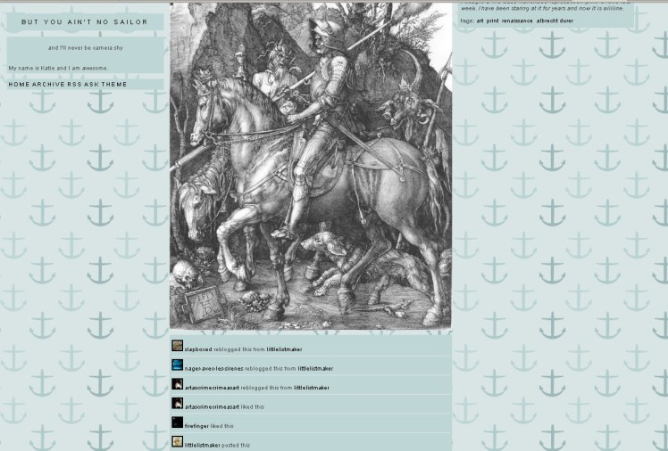 Le Chevalier, la Mort et le Diable : une des célèbres gravures de Dürer, postée sur Tumblr et re-bloguée par de nombreux utilisateurs.