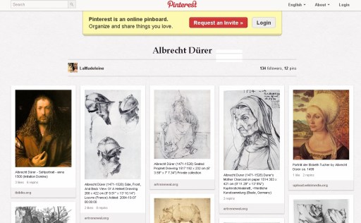 Un dashboard sur Pinterest consacré aux oeuvres de Dürer.