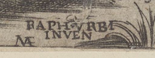 Or au bas de l’image, un peu cachée dans l’herbe, on trouve cette inscription : « RAPH-URBI INVEN MAF ».