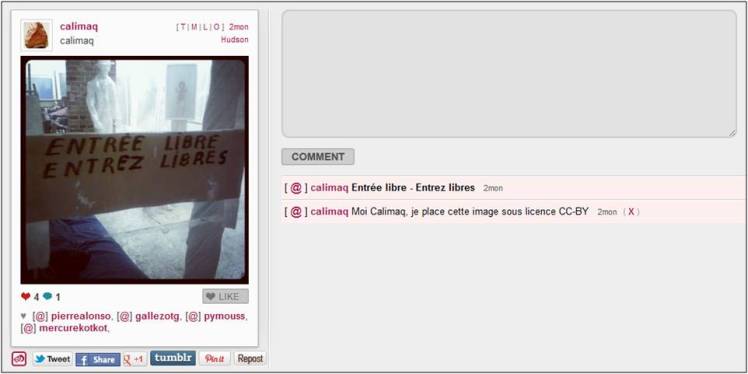 Ce choix d’Instagram (qui montre bien, comme le dit Lawrence Lessig, que sur Internet Code is law) est contestable, car il « écrase » la volonté de ses utilisateurs qui voudraient mettre en partage leurs photographies. A titre personnel, j’avais choisi de ruser en ajoutant sous chacun de mes clichés un commentaire indiquant « Moi Calimaq, je place cette oeuvre sous licence Creative Commons BY« . Cette solution était fastidieuse et un peu fragile juridiquement, sans doute, mais c’était un moyen de contourner l’embargo imposé ipso facto par Instagram.