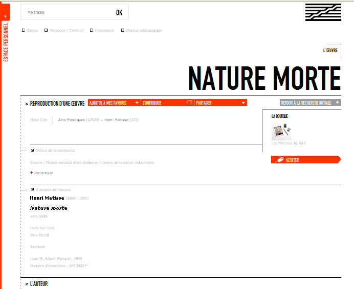 Imaginerait-on un musée qui présenterait aux visiteurs des cadres vides dans ses salless ? C’est pourtant ce qui se passe pour le Centre Pompidou Virtuel. On notera en revanche dans le cas de Matisse que les mêmes ayants droit qui refusent la mise en ligne gratuite par le Musée acceptent par contre que cette notice vide contienne un lien vers des produits dérivés à acheter dans la Boutique…