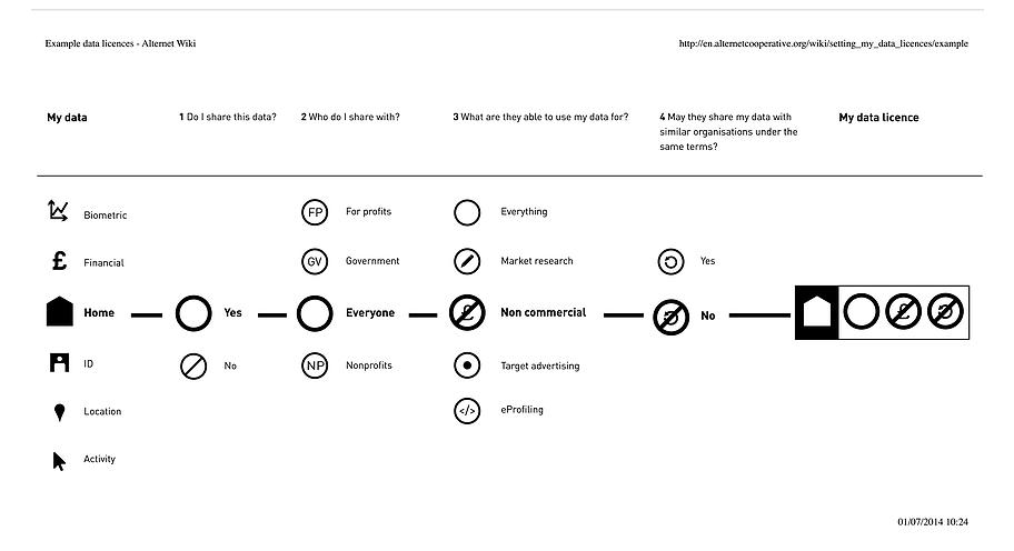Quelle forme concrète pourraient prendre de tels Privacy Commons ? On peut en avoir un aperçu intéressant dans le cadre du projet « The Alternet », qui propose des « Data Licences » avec des jeux de logos permettant aux individus de déterminer finement les usages autorisés de leurs données par des tiers, plutôt que de se les faire imposer par des plateformes via leurs CGU.