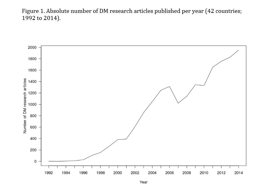 L’intérêt de ce travail de recherche réside d’abord dans sa méthodologie. Par une jolie mise en abyme, les trois chercheurs ont choisi de recourir au Text Mining pour vérifier si les rigidités du droit d’auteur avait ou non impact sur l’utilisation du TDM dans les activités de recherche. Ils ont eu pour cela l’idée de conduire une opération de fouille de texte au sein de l’outil Web of Science proposé par Thomson Reuters, qui recense des milliers de journaux académiques. Ils ont ainsi pu constater que sur une période s’étendant de 1992 à 2014 le nombre des articles utilisant le mot clé « Data mining » dans leur description s’accroît constamment pour atteindre un total de 18 441 travaux publiés par des chercheurs dans le monde.