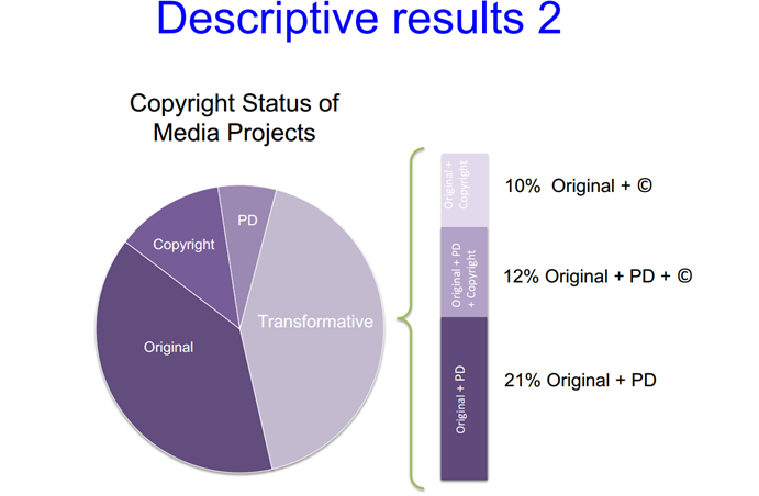 Un second champ d’étude de ce rapport a porté sur des projets créatifs présentés sur la plateforme de crowdfunding Kickstarter. Les chercheurs ont identifié que ces projets pouvaient se trouver dans quatre situations : 1) produire leurs propres contenus originaux, 2) obtenir via des licences le droit de réutiliser des contenus protégés par des droits d’auteur produits par des tiers, 3) réutiliser des contenus appartenant au domaine public, 4) mixer ces différentes approches.