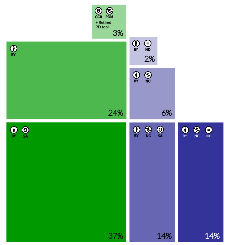 Répartition de l’usage des différentes licences Creative Commons en 2015.