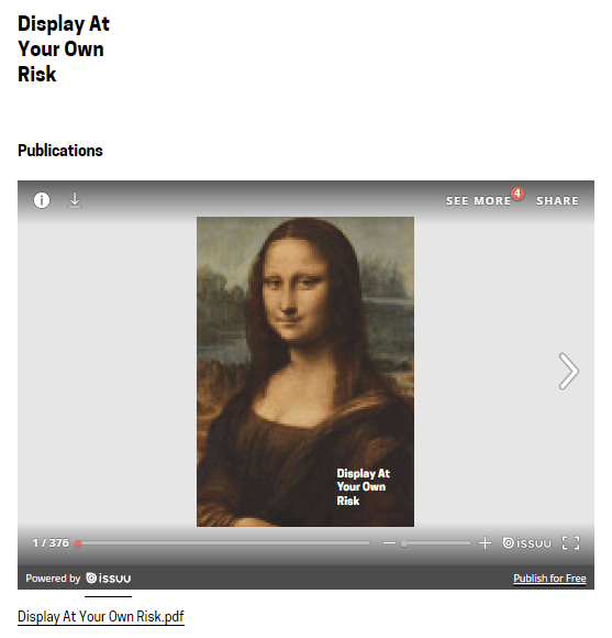 L’inspiration pour cette exposition « Pirate » provient d’un autre projet, intitulé Display At Your Own Risk (DAYOR) qui a été lancé le 26 avril 2016 (lors de la journée mondiale de la propriété intellectuelle !). Il s’agit d’un « kit Open Source » pour la réalisation d’une exposition d’une centaine de reproductions d’oeuvres, téléchargées depuis les sites de grands musées partout dans le monde. La majeure partie de ces images font l’objet de restrictions plus ou moins larges à la réutilisation, qui rendent cette exposition illégale (ou du moins risquée…). Le concept a vu une mise en application le 8 juin 2016, avec une exposition organisée dans un phare à Glasgow.