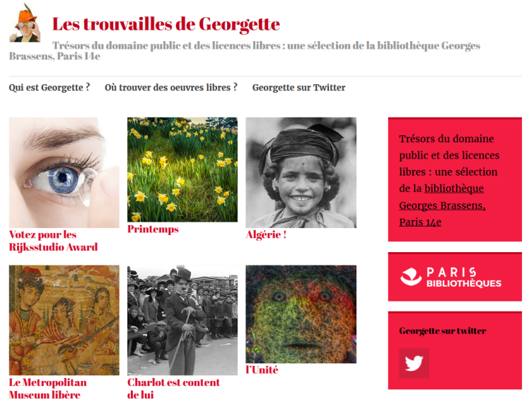 De ce point de vue, je voudrais signaler l’excellente initiative de la bibliothèque Georges Brassens du 14ème arrondissement de Paris, sur laquelle je suis tombée récemment. L’établissement a en effet ouvert un blog spécialement dédié à la mise en valeur des « trésors du domaine public et des licences libres ». On y suit les aventures de Georgette, le « double numérique de la bibliothèques Georges Brassens », exploratrice du web à la recherche de contenus libres qui partage avec nous ses découvertes.
