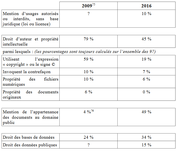 Cette évolution a été documentée de manière précise, grâce à un mémoire publié en janvier dernier par Laura Le Coz, élève conservatrice à l’ENSSIB. Intitulé « Patrimoine numérisé et Open Content : quelle place pour le domaine public dans les bibliothèques numériques patrimoniales ?« , ce travail contient notamment une étude comparative des conditions d’utilisation de 126 bibliothèques numériques françaises. Or il se trouve que j’avais réalisé de mon côté en 2009 une enquête similaire, qui à l’époque, mettait en lumière une politique globalement très restrictive de diffusion du domaine public numérisé (88% des établissements ne permettaient aucune réutilisation des fichiers).
