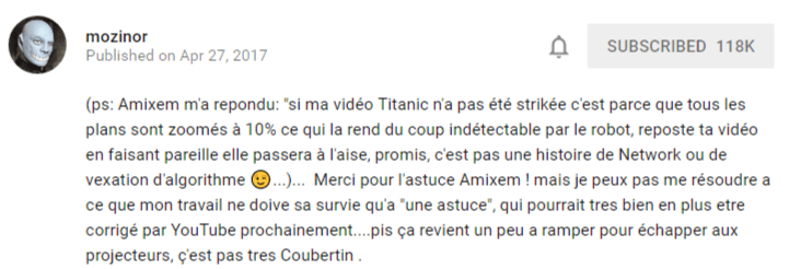 Mozinor a été un peu raide en se refusant à utiliser une technique de contournement sur Youtube pour éviter la détection, tel qu’augmenter légèrement le nombre d’ images par seconde sur une vidéo etc. Par ailleurs le « fair use » (usage loyal?) est parait-il assez différent de notre « droit de citation ».