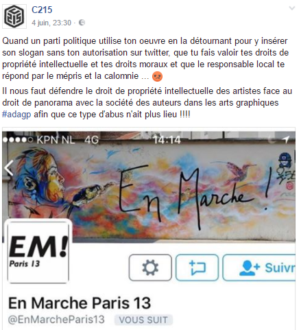 Or ici, C215 explique que ce qui lui arrive justifie de continuer à lutter contre le « droit de panorama » qu’il oppose au « droit de propriété intellectuelle des artistes », comme si c’était sa négation et la porte ouverte à tous les abus. C’est déjà inexact sur le plan de l’état du droit en France, étant donné que la nouvelle exception n’est pas utilisable par les personnes morales comme l’est le comité électoral d’En Marche dans le 13ème arrondissement. Mais même si l’exception était ouverte aux personnes morales (ce qui mon sens devrait être le cas), l’usage que C215 dénonce ici ne serait pas licite.
