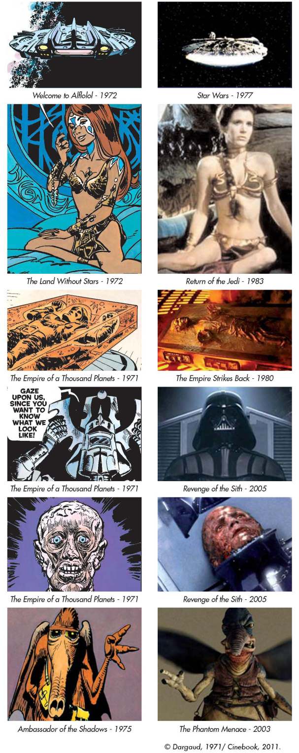 Ce n’est pas tellement le film de Besson qui m’intéresse, mais plutôt les circulations complexes d’influences qui existent entre l’univers de la BD originale, Valérian et Laureline, et le cinéma de Science Fiction. Avec la sortie du film, de nombreux articles ont refait surface qui insistent sur les nombreux emprunts que George Lucas, par exemple, a effectué à l’univers de Valérian pour élaborer celui de Star Wars. Les choses sont même allées plus loin, vu que Jean-Claude Mézières a écrit deux fois à Lucas pour l’interpeller sur des similitudes qu’il trouvait un peu trop marquées à son goût. George Lucas ne répondit jamais, mais on trouve facilement sur Internet des comparatifs qui pointent des ressemblances flagrantes. La forme du Faucon Millenium, la cryogénisation dans un bloc de carbonite de Han Solo, le bikini métallique de la princesse Leia dans Le Retour du Jedi : tous ces éléments iconiques (et un certain nombre d’autres…) figuraient déjà avec près d’une décennie d’avance dans les albums de Valérian et Laureline. Certains témoignages attestent par ailleurs que George avait eu accès aux Etats-Unis à ces bandes dessinées, ainsi qu’à celles d’auteurs français comme Moebius ou Druillet, à qui il emprunta aussi des éléments pour Star Wars.