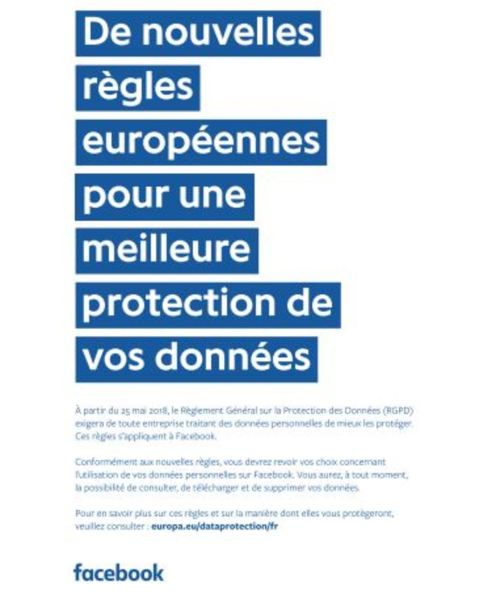 Alors que le scandale Cambridge Analytica est encore dans tous les esprits, Facebook a déployé beaucoup d’efforts pour tenter de rassurer ses utilisateurs européens, allant jusqu’à acheter des publicités en pleine page dans la presse pour vanter les mérites du RGPD et afficher sa volonté de s’y conformer.