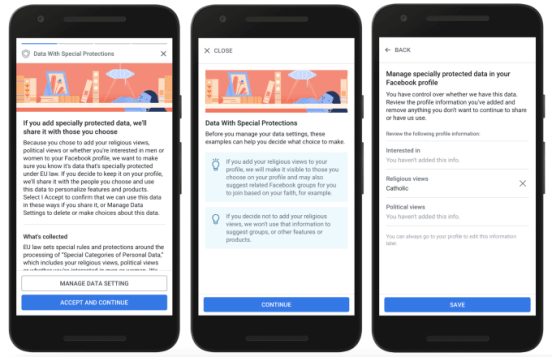 A toutes les étapes, vous pouvez appuyer sur le joli bouton bleu « J’accepte et je continue » sans avoir nécessairement scrollé pour lire les informations. Si vous appuyez sur le vilain bouton gris « Modifier les paramètres », vous devez en passer par des écrans intermédiaires où Facebook vous présente des arguments pour essayer de vous dissuader de retirer des informations avant de vous laisser faire votre choix. Il semble que tout ait été pensé pour que les utilisateurs passent leur chemin sans opposer de résistance, tout en introduisant des « frictions » lorsqu’ils souhaitent effectuer des changements.