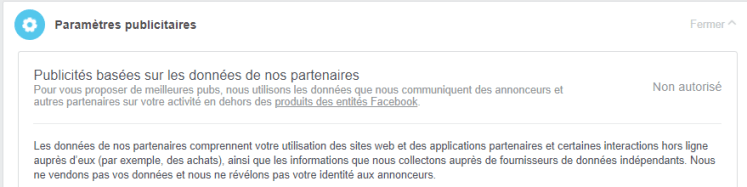 L’écran de désactivation des publicités basées sur les « données de partenaires de Facebook ».