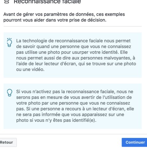 On notera quand même la manière dont Facebook s’efforce d’influer sur la décision de ses utilisateurs, en mettant en avant les nombreux « bienfaits » qui résulteraient de l’activation de cette fonctionnalité, comme la protection contre l’usurpation d’identité ou même l’assistance aux personnes malvoyantes (mais sans dire, bien sûr, que cela permettra aussi à l’entreprise de constituer une des plus gigantesques bases de données biométriques au monde…).