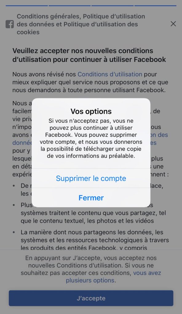 Facebook nous dit que nous avons « plusieurs options » si nous ne souhaitons pas accepter ces changements, mais en réalité, il n’y a aucune alternative à la suppression du compte en cas de refus. La plateforme propose juste de télécharger ses données avant de la quitter, ce qui permet à l’utilisateur d’exercer le droit à la portabilité prévu dans le RGPD.