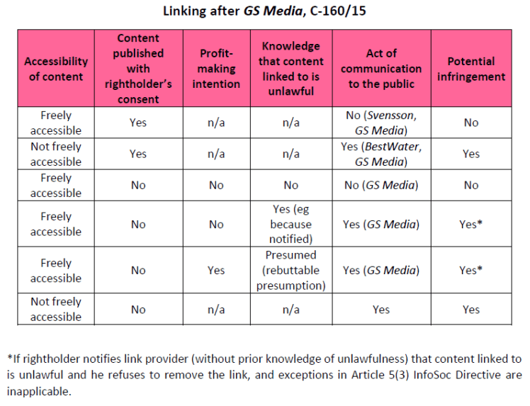 Un tableau qui illustre l’effroyable casse-tête du statut des liens hypertexte après l’arrêt GS Media. Source : IPKAT.