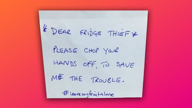 La frustration de ne pouvoir attraper les coupables de « vol » génère parfois des comportements vengeurs s’exprimant par le biais de messages laissés sur les frigos collectifs par les victimes. Il existe des masses d’articles recensant les malédictions les plus drôles ou les plus véhémentes collées sur des réfrigérateurs. Ce qui frappe en les lisant, c’est la volonté d’attirer la honte ou la culpabilité sur les malfaiteurs, tout en suscitant la désapprobation du groupe à l’encontre de ces pratiques, avec parfois – comme ci-dessous – des allusions à des sanctions d’autant plus terribles qu’elles ne pourront jamais être exercées…
