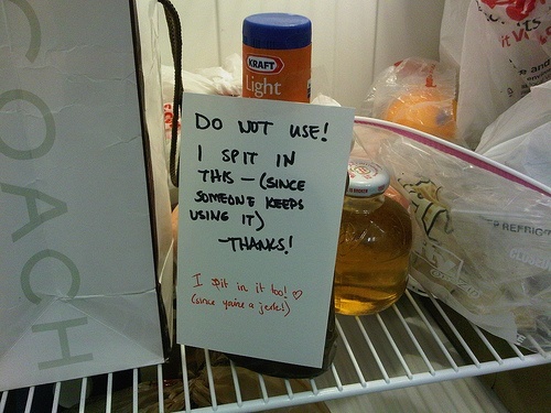 Mais lorsque ce procédé ne suffit pas, on voit ressurgir des comportements primitifs où la pollution reprend ses droits pour signifier l’appropriation. Ci-dessous, on voit par exemple une personne prévenant son « voleur de frigo » qu’elle a craché dans sa bouteille pour le dissuader de l’utiliser (et le voleur de répondre qu’il en a fait autant en représailles !).
