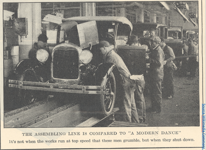 L’image ci-dessous montre une chaîne de montage dans une usine Ford durant l’entre-deux guerres. Elle a pour légende cette phrase : « Ce n’est pas lorsque la chaîne tourne à pleine vitesse que les ouvriers grognent, mais lorsqu’elle ralentit ». Et le journaliste de comparer l’activité des travailleurs à une « danse moderne »…