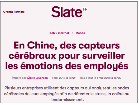 La manière dont les technologies sont mises en œuvre au sein des entreprises peut déjà conduire à des dérives dignes des pires épisodes de la série Black Mirror. On commence par exemple à voir apparaître en Chine des applications particulièrement inquiétantes, comme des casques enregistrant les émotions des salariés pour détecter leur état de fatigue, de stress, de concentration ou de bien-être, etc. Déjà testés dans plusieurs groupes chinois, ces procédés ont visiblement entraîné des réticences de la part des travailleurs, un peu comme le chronométrage des ouvriers avait provoqué lui aussi des résistances.