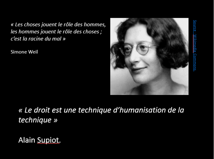 « Le droit est une technique d’humanisation de la technique ». Cette phrase est issue de l’ouvrage de philosophie du droit Homo Juridicus écrit en 2009 par Alain Supiot, professeur au collège de France. Il y explore ce qu’il appelle la « fonction anthropologique du droit », c’est-à-dire le rôle que joue le droit pour nous « instituer comme humains ». Il y consacre de longs développements aux rapports entre le droit et la technique, en faisant notamment remarquer que le droit du travail trouve son origine dans une fonction de protection des travailleurs vis-à-vis des risques induits par les machines industrielles, avec les premières législations sur les accidents du travail en 1898. Le droit s’est alors interposé entre les hommes et les machines pour préserver la dignité des premiers.