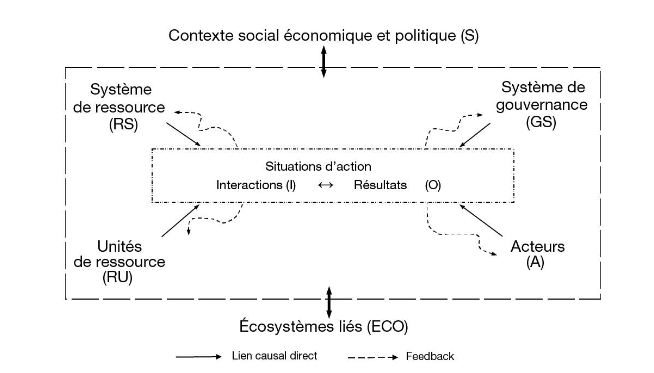 Dans un système socio-écologique complexe, des sous-systèmes tels qu’un système de ressources (par exemple, une pêcherie côtière), des unités de ressources (des homards), des utilisateurs (les pêcheurs) et les systèmes de gouvernance (organisations et règles régissant la pêche dans cette zone) sont relativement séparables, mais interagissent pour produire des résultats au niveau du système global, qui a son tour va affecter ces sous-systèmes et leur fonctionnement, ainsi que d’autres systèmes socio-écologiques plus ou moins importants[16].