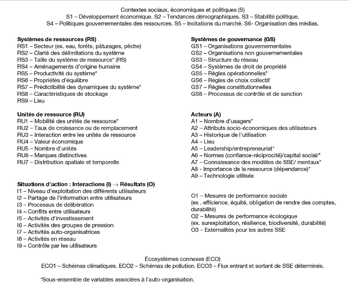 Toutes les ressources utilisées par les humains sont encastrées (embedded) dans des Systèmes Socio-Ecologiques complexes (SSE). Les SSE sont composés de multiples sous-systèmes et de variables internes à ces sous-systèmes à de multiples niveaux, analogues à des organismes composés d’organes, les organes de tissus, les tissus de cellules, les cellules de protéines[2].