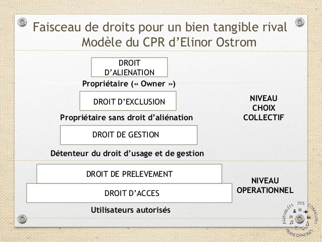 Cette question cruciale du droit d’aliénation avait bien été identifiée par Elinor Ostrom dans ses analyses sur la gestion des Communs. Elle utilise notamment pour cela la notion de faisceaux de droits (Bundle of Rights), issue de l’école du réalisme juridique aux États-Unis, pour montrer que la propriété peut se « démembrer » en un certain nombre de prérogatives. Là où la théorie économique classique postule que le marché a besoin pour fonctionner de manière optimale d’une réunion des éléments du droit de propriété (usus, fructus et abusus) entre les mains d’un propriétaire unique, Ostrom montre au contraire que, dans la gestion d’une ressource commune, la propriété forme un faisceau complexe dont les parties prenantes se partagent les éléments leur conférant des « statuts » différents (voir le schéma ci-dessous).