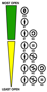 Quel est alors le statut juridique exact des enregistrements musicaux figurant dans le catalogue de Jamendo Licensing ? En réalité, la plateforme propose aux artistes recourant à ses services pour se diffuser de choisir par les six licences Creatives Commons possibles qui, comme on le sait, sont plus ou moins ouvertes par le biais d’un système d’options. Or parmi ces licences, seules certaine sont des licences « libres » au sens propre du terme (CC-BY, CC BY-SA, CC0), mais toutes les autres licences – celles comportant des clauses NC (pas d’usage commercial) ou ND (pas de modification) – ne sont pas des licences libres au sens de la définition établie par la Free Software Foundation. Il s’agit de licences dites « de libre diffusion« , qui permettent certes des usages plus étendus que l’application par défaut du droit d’auteur, mais tout en maintenant certaines restrictions (c’est d’ailleurs tout le sens du slogan des Creative Commons « Some Rights Reserved » par rapport au classique « All Rights Reserved »).