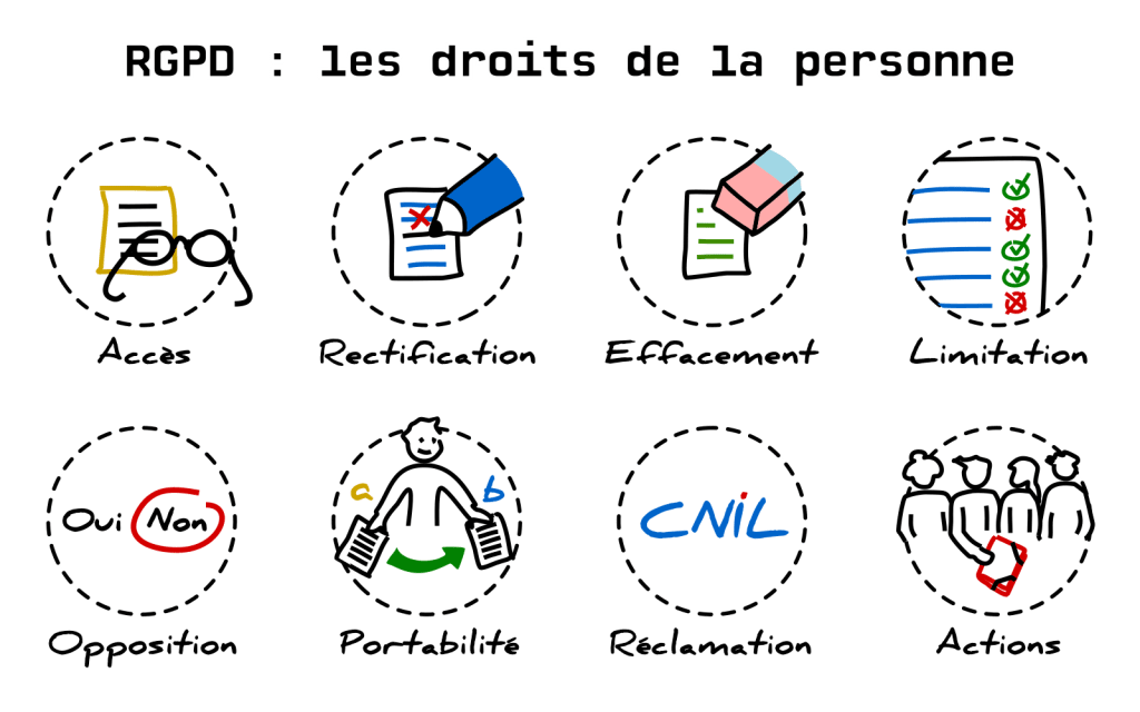 Ces prérogatives (droit à l’information, droit d’accès, droit d’opposition droit à l’effacement, etc.) ressemblent à ce que l’on appelle les « droits des personnes » qui figurent dans le RGPD (voir ci-dessous).